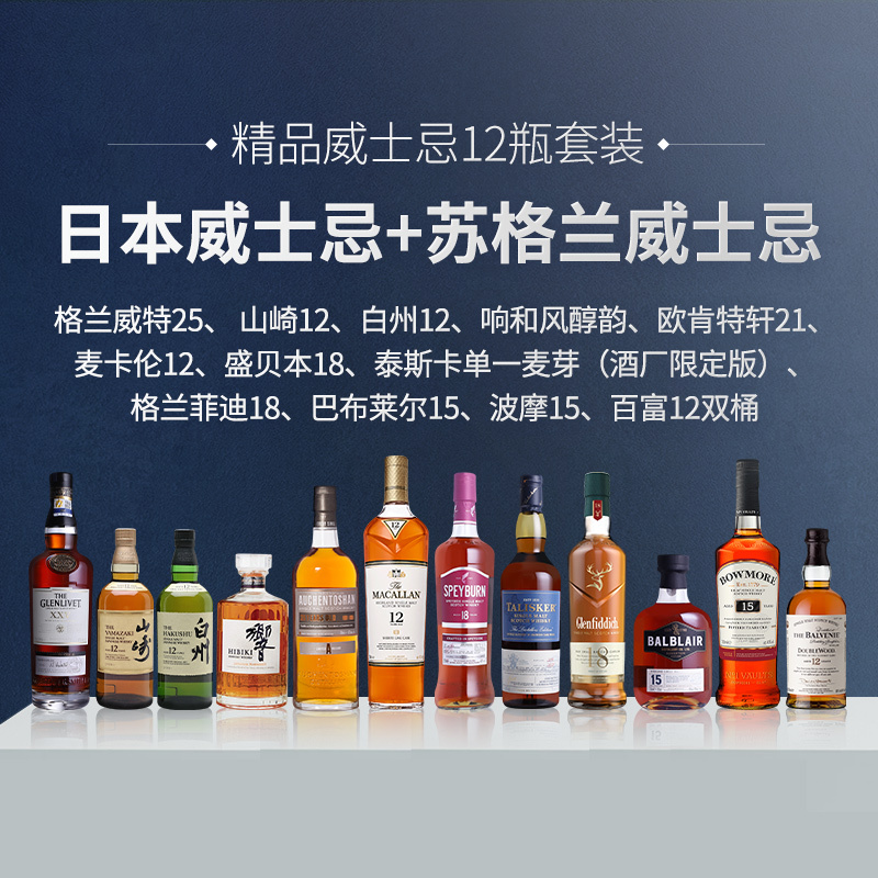 【精品威士忌12瓶套装】格兰威特25、 山崎12、白州12、响和风醇韵、欧肯特轩21、麦卡伦12、盛贝本18、泰斯卡单一麦芽(酒厂限定版)、格兰菲迪18、巴布莱尔15、波摩15、百富12双桶